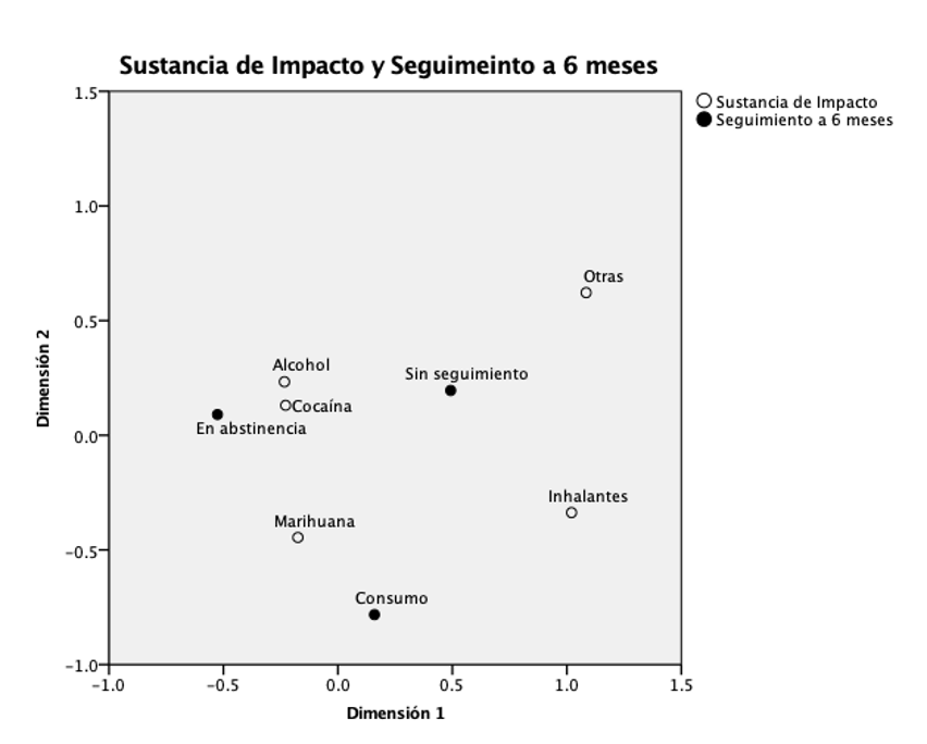 Figura 2 Relación entre sustancia de impacto y seguimiento a seis meses. Las distancias relativas entre los puntos indican el grado de asociación de las sustancias de impacto con el seguimiento a seis meses. Así, se puede apreciar que quienes habían sido consumidores de alcohol registraron mayor reporte de abstinencia que los que habían sido consumidores de inhalantes. Las dimensiones corresponden solamente al modelo generado en el análisis de correspondencias.