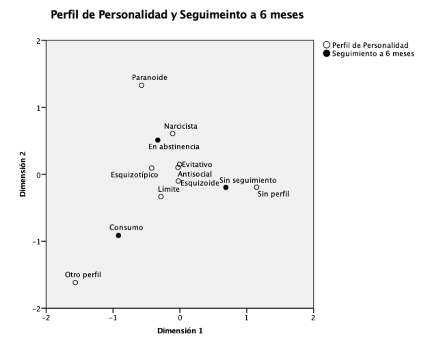 Considerando que el modelo explica 20.4% de la variación, se identificó el perfil paranoide y narcisista con mayor frecuencia en abstinencia, otro perfil con mayor frecuencia de consumo tras seis meses después del egreso y sin diagnóstico con mayor frecuencia sin seguimiento.