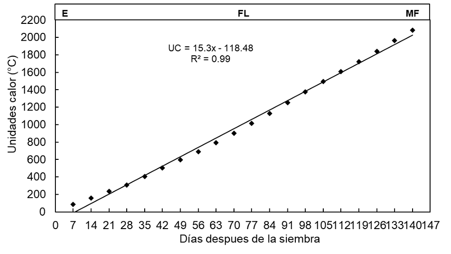La acumulación de UC durante el ciclo del cultivo mostró una relación lineal con el tiempo que respondió al modelo y = a + bx (Figura 2). El genotipo en estudio presentó la E a los 5 dds con un requerimiento de calor de 59.5 UC. La floración ocurrió a los 76 dds con 1012 UC, y la MF fue a los 140 dds (2082 UC). Cabe señalar que la acumulación total de UC se relaciona con la duración del ciclo del cultivo.
