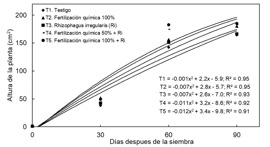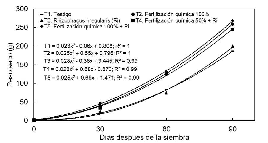 En cuanto al peso seco de la planta, la aplicación del fertilizante químico (100%) en asociación con Rhizophagus irregularis presentó el valor más alto (268.3 g planta-1) a los 90 dds, esto con respecto a los demás tratamientos (Figura 5). Durante el desarrollo del cultivo, las tendencias del peso seco se ajustaron a un modelo cuadrático. Así, el peso seco de la planta por día fue de 0.69 g con la fertilización química (100%) y biológica, el cual superó a la fertilización química sola (0.55 g día-1), así como también a la fertilización química al 50% + Rhizophagus irregularis (0.58 g día-1).
