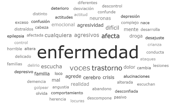 Cabe mencionar que algunas de las palabras hacen referencia a la impresión que tienen los familiares sobre lo difícil (3), horrible (1), complejo (1), delicado (1), duro (1) y triste (1) que puede llegar a ser esta enfermedad. Esta sensibilidad también formó parte de la representación mental que tuvieron los participantes en el estudio sobre este padecimiento.
