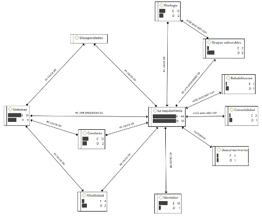 La red de vínculos entre las distintas categorías muestra las distintas formas de interacción entre todas las variables asociadas con la conceptualización de la esquizofrenia. En el diagrama procesado con ATLAS.ti se observan una serie de interacciones importantes entre más de una categoría. Se puede dilucidar cómo las categorías de “conducta” y “afectividad” se vinculan como variables dependientes de la categoría esquizofrenia y de los síntomas. Es decir, la conducta y la afectividad de las personas estuvieron condicionadas por la presencia del trastorno y la sintomatología que lo caracteriza. La discapacidad, según estas vinculaciones, también estuvo determinada por la presencia del padecimiento y el tipo de síntomas.