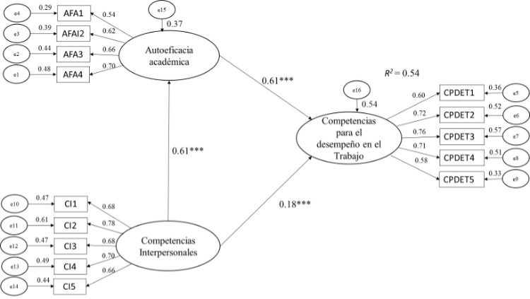Figura 2 Coeficientes estandarizados y errores estándar del modelo relación entre competencias interpersonales, autoeficacia y competencias para el desempeño en el trabajo.