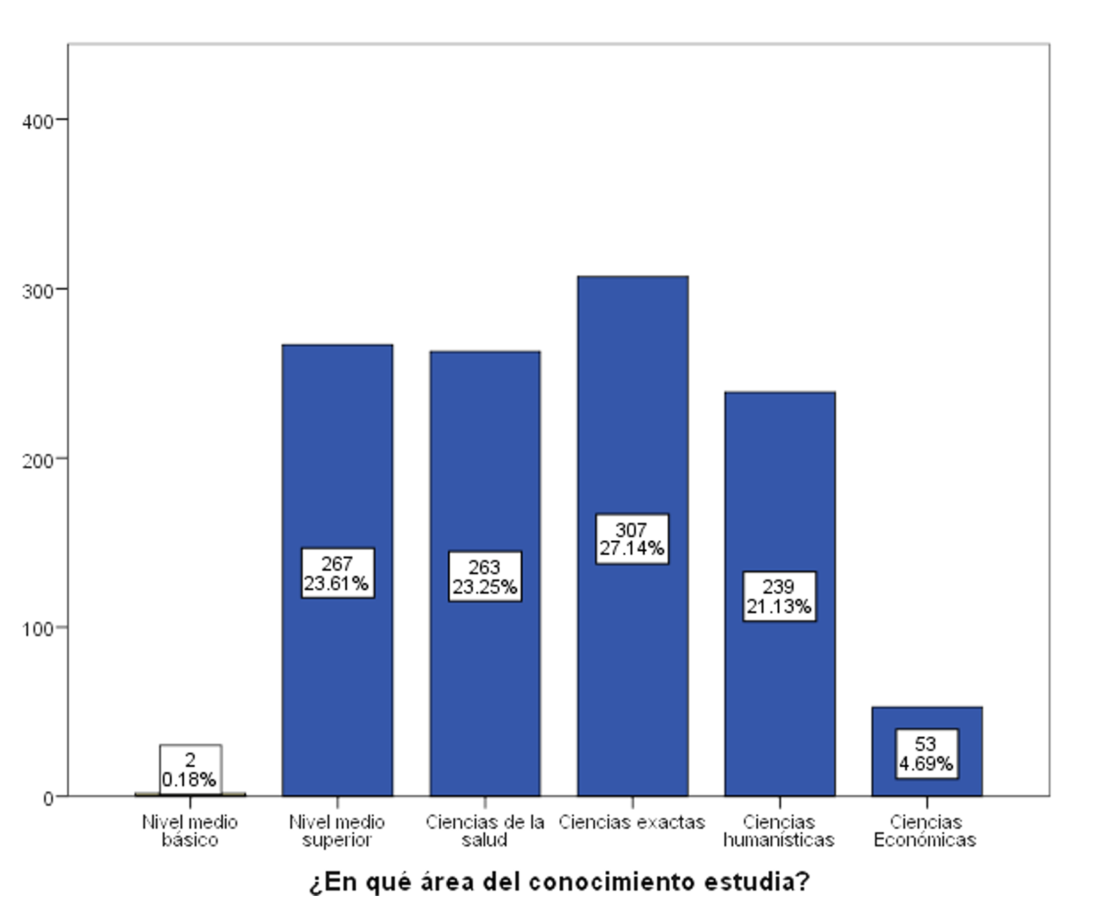 Se elaboró la Figura 2, que indica cómo se distribuyen los 1131 encuestados según el área del conocimiento. De esta forma, solamente dos estudiantes de Nivel Medio Básico (0.18%) respondieron el cuestionario, 267 estudiantes (23.61%) cursan Nivel Medio Superior, 263 estudiantes (23.25%) se encuentran en alguna carrera que tiene relación con el área de ciencias de la salud, 307 alumnos están dentro de las ciencias exactas (27.14%), 239 alumnos (21.13%) se encuentran inscritos a un área de las ciencias humanísticas y 53 estudiantes (4.69%) cursan alguna licenciatura del área de ciencias económicas. Todo lo anterior está dentro de la oferta educativa de la UAZ.