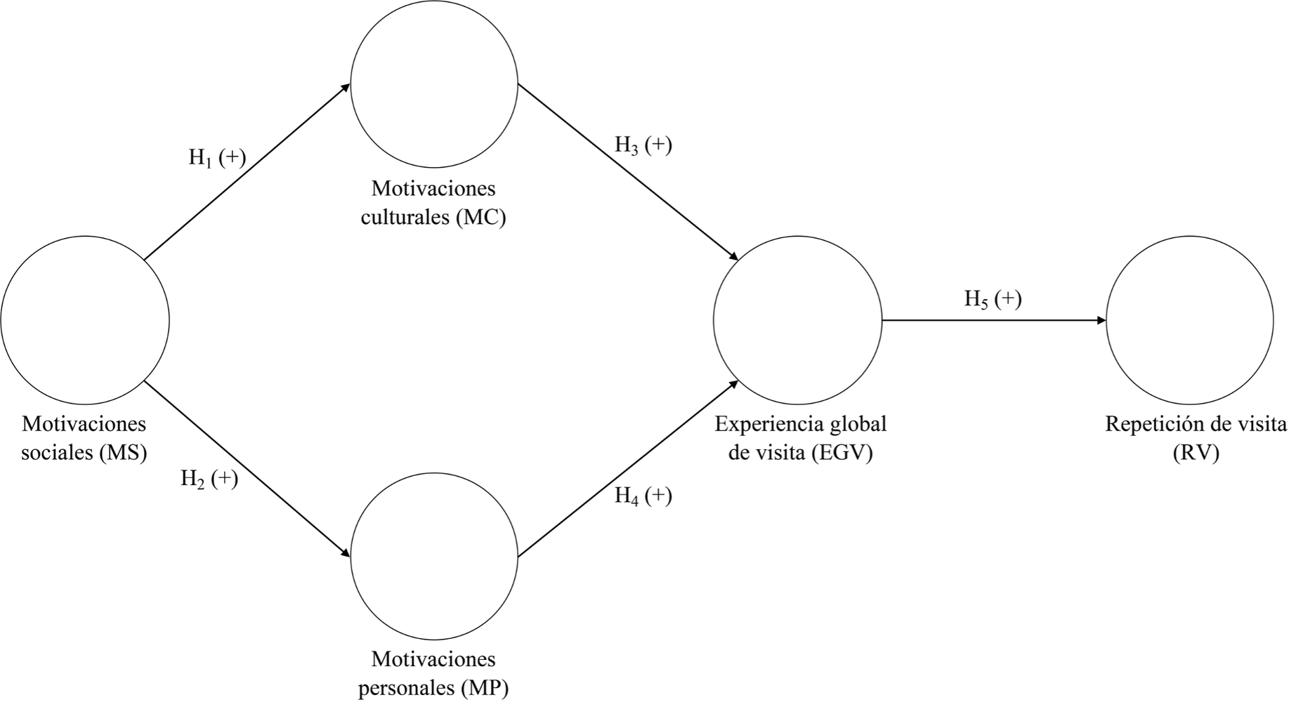 Las motivaciones en festivales se basan en la búsqueda de experiencias específicas (que según la esencia del evento puede ser culturales, gastronómicas, religiosas, espirituales, musicales, deportivas, entre otras), convirtiéndose en expectativas a comprobar, y en caso de que estas se cumplan satisfactoriamente, existirá el deseo de volver (Chang, 2011; Ramesh & Jaunky, 2021). Así, cuando un individuo visita un festival, tiene una experiencia sobre lo que vivió, vio y sintió, juicio que le permitirá tener la intención de repetir, o no, la visita (Kim et al., 2015; Perovic et al., 2018; Tkaczynski et al., 2019; Wan & Chan, 2011). En este sentido, la hipótesis formulada es (Figura 1):