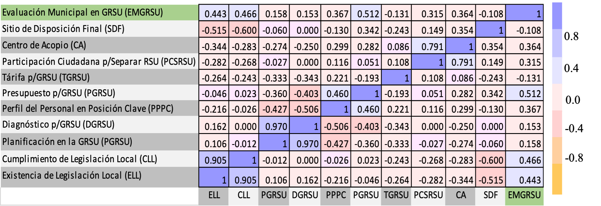 Se aplicó un estudio estadístico usando el coeficiente de correlación. Se usó la evaluación final de aquéllos municipios que obtuvieran una calificación mínima de 28 puntos, donde su calificación en la GRSU es considerada como media, contra cada uno de los indicadores que evalúan aspectos en la GRSU a nivel municipal (Tabla 1).