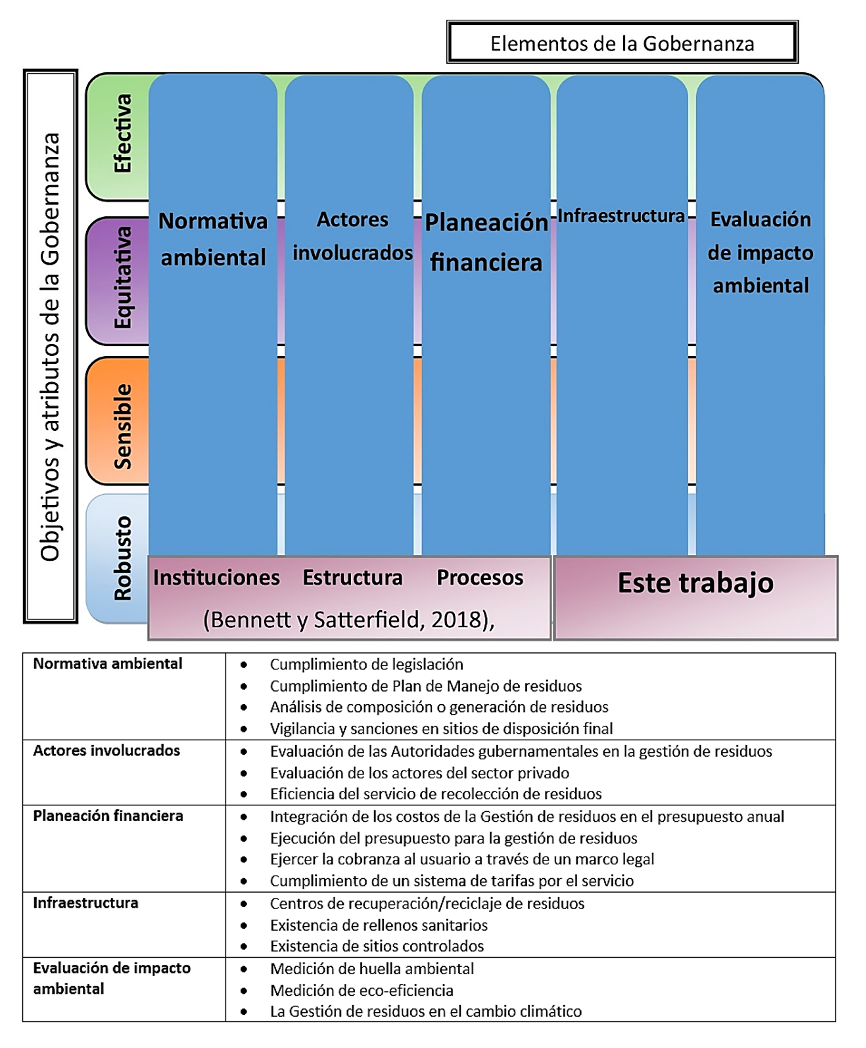 El objetivo central de la gobernanza ambiental es mantener o mejorar la capacidad de los sistemas para que funcionen y produzcan servicios con enfoques de conservación de la biodiversidad, de acuerdo con Bennett & Satterfield (2018). Estos mismos autores propusieron un marco de la gobernanza ambiental, aplicando la evaluación de objetivos y atributos en tres aspectos fundamentales: 1) Instituciones, 2) Estructura y 3) Procesos. A partir de estos aspectos, este trabajo propone un marco de la gobernanza ambiental aplicado a la gestión de residuos, empatando los tres aspectos propuestos por Bennett & Satterfield (2018) y agregando dos aspectos nuevos: Infraestructura y Evaluación del impacto ambiental (Figura 3), que representan un modelo replicable para estimar la gobernanza ambiental en la GRSU.
