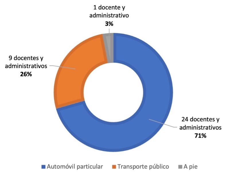 Los resultados obtenidos en la encuesta-entrevista 2 que se aplicó a docentes y administrativos del sector educativo de Jalcocotán muestran que el 88% del total vive en la ciudad de Tepic, Nayarit, y el 71% se traslada en automóvil particular que utiliza gasolina como fuente de combustible.