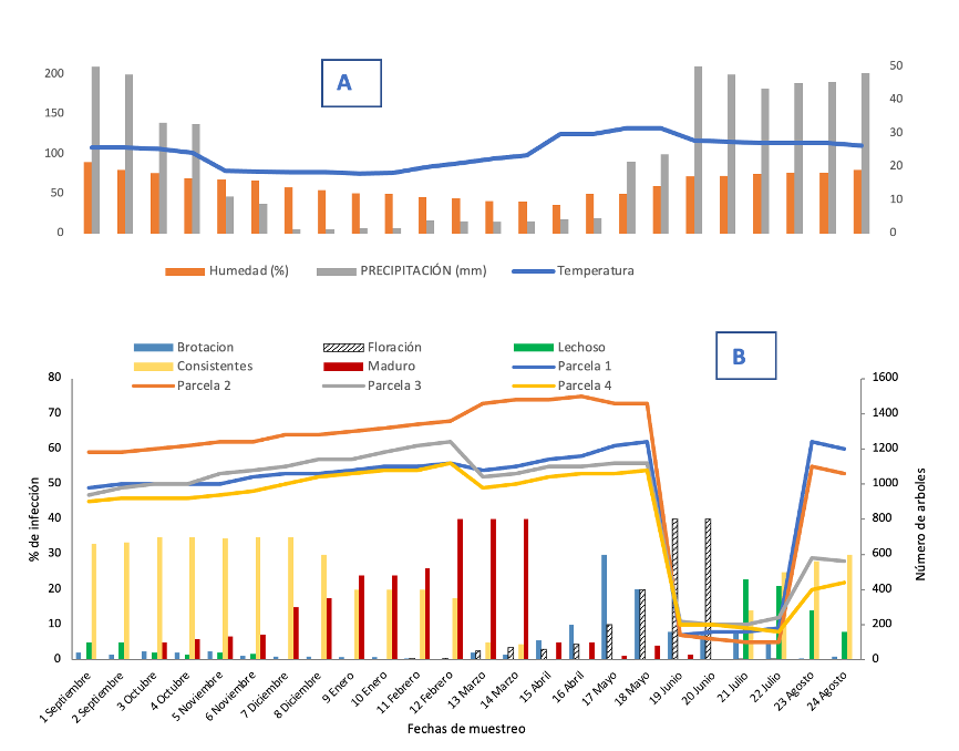 Con los resultados fenológicos obtenidos se puede inferir que el ciclo epidemiológico de la enfermedad se detiene en el periodo de cosecha, que va de enero a mayo, y es una vez empezado el periodo de lluvias que la incidencia baja significativamente, probablemente por la defoliación de los cafetos y por el lavado y transporte de las esporas en las hojas causado por las precipitaciones. Esto pudo derivar en el inicio de varios ciclos epidemiológicos de la enfermedad, lo que concuerda con Kushalapa & Eskes (1989), quienes mencionan que Hemileia vastatrix requiere condiciones específicas para infectar las hojas de la planta de café, como la salpicadura del agua de lluvia con la que se empieza la dispersión entre hojas y entre plantas, además de la presencia de humedad en el envés de la hoja que permite su germinación.