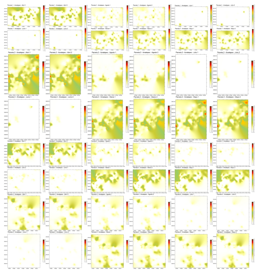 Se obtuvieron 96 semivariogramas teóricos del análisis de los datos de las cuatro parcelas evaluadas, los cuales mostraron una distribución espacial en agregados. Los modelos obtenidos fueron exponencial, gaussianno y esférico, que fueron validados con los parámetros de validación cruzada, como se muestra en la Tabla 1.