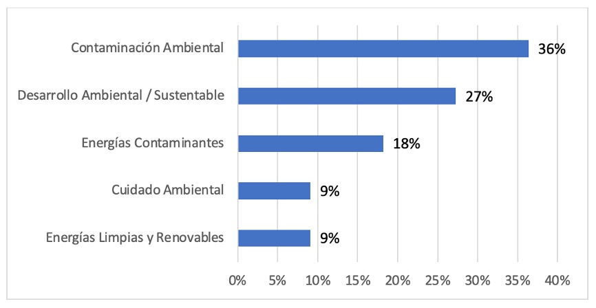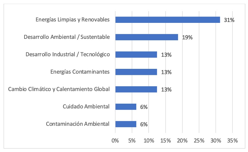Seguido, se aprecia la categoría de Desarrollo Ambiental/Sustentable con 27% de las menciones. Se reconoce la existencia de una problemática en el campo de los hidrocarburos dado que su propósito es el de producir petróleo; sin embargo, la complicación deviene de conciliar una forma rentable, sustentable y, sobre todo, en comunión con el medio ambiente. De igual forma, se comprenden aquí las implicaciones biológicas, económicas, políticas y sociales del daño ambiental en un contexto global.