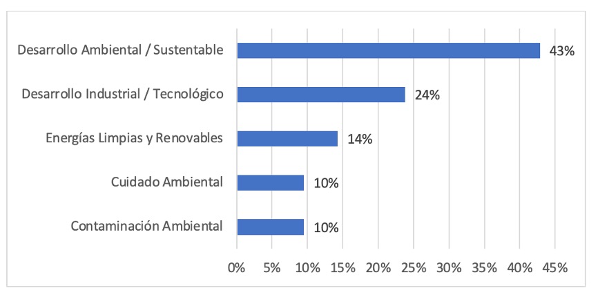Mientras tanto, las categorías de Cuidado Ambiental y Contaminación ambiental reflejan 10% de las incidencias. Aquí se aborda el mejoramiento y difusión de procedimientos y productos encausados a la protección del medio ambiente, así como al aprovechamiento y conservación de los bienes naturales, sin descuidar la generación y gestión de contaminantes a través de la prevención, reducción, reciclaje y reutilización de los residuos.