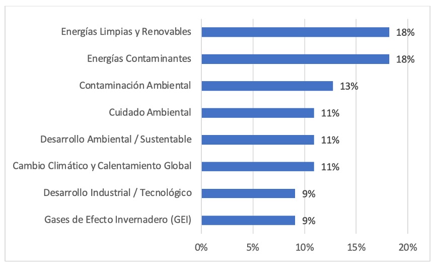 En la categoría de Energías Contaminantes y en la de Cambio Climático y Calentamiento Global, ambas con 13% de incidencia, se identifican áreas de oportunidad con respecto al uso de los bienes energéticos renovables (sol, viento y subsuelo) con los que cuenta México, dado que se reconoce que 70% de la producción de energía en el país depende de fuentes convencionales. Esto muestra un ámbito decadente en la profesión de Ingeniería Mecánica Eléctrica en la industria petrolera, puesto que, al ser una energía no renovable, contribuye con el cambio climático, visto como uno de los mayores retos de nuestra época.