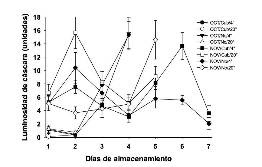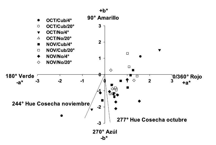 Al momento de la cosecha y durante el almacenamiento, los frutos presentaron color negro, con valor promedio del ángulo Hue de 260° (Figura 1). Los factores a* y b* del color mostraron valores cercanos a 0 (entre -2 y 2.5, y entre -6.2 y 1.5, respectivamente). Los valores de luminosidad de la cáscara de los frutos cosechados en octubre presentaron valores cercanos a 0, mientras que la luminosidad en los frutos cosechados en noviembre se incrementó a 5 (Figura 2).