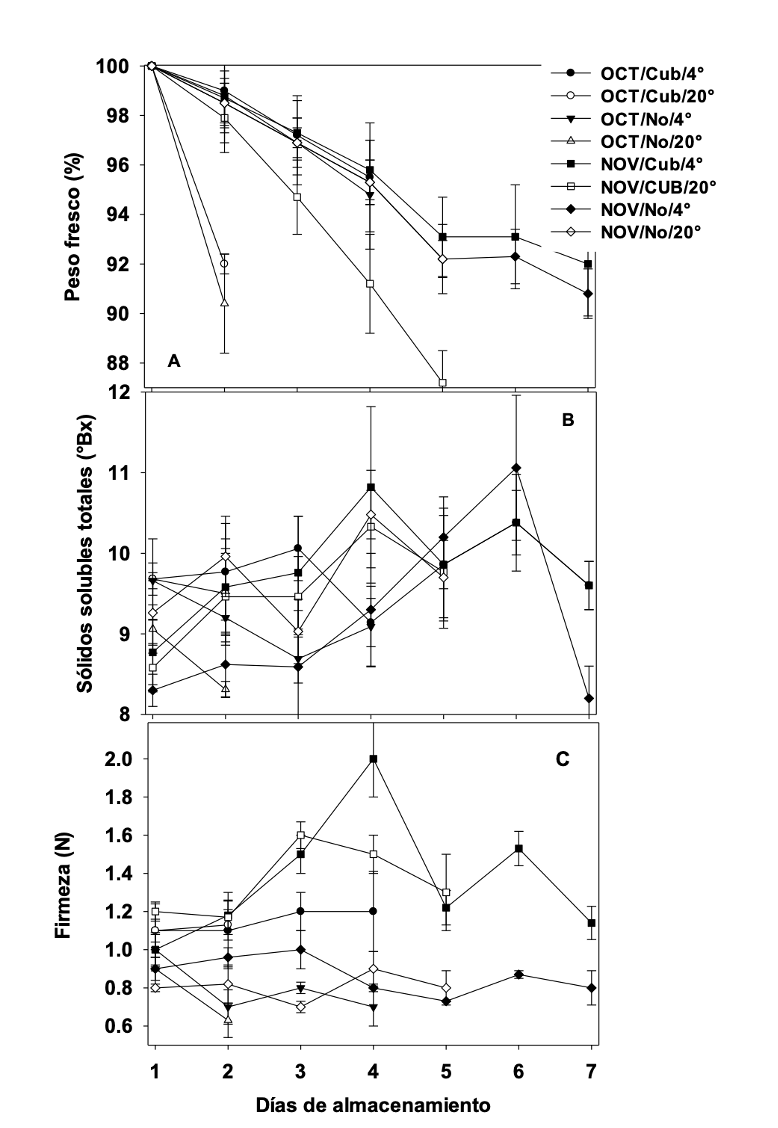La refrigeración a 4 °C disminuyó la pérdida de peso fresco; por ejemplo, los frutos cosechados en noviembre perdieron 6% de peso fresco menos cuando se almacenaron a 4 °C, en comparación con los frutos almacenados a 20 °C. Por otro lado, la cobertura comestible redujo entre 1% y 4% la pérdida de masa fresca a 4 °C y 20 °C, respectivamente (Figura 3). Con relación a los sólidos solubles totales, a la cosecha 70% de los frutos de noviembre presentaron menos de 9 °Bx, mientras que el mismo porcentaje de los frutos cosechados en octubre presentaron 9.5 °Bx (Figura 3).