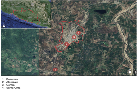 Se seleccionaron cuatro lugares clave (el basurero de Las Vigas y las colonias El Aterrizaje, Centro y Santa Cruz) para llevar a cabo el proceso de observación de RSU y, por ende, el registro de las prácticas y actitudes ciudadanas en el manejo de estos residuos (Figura 1).