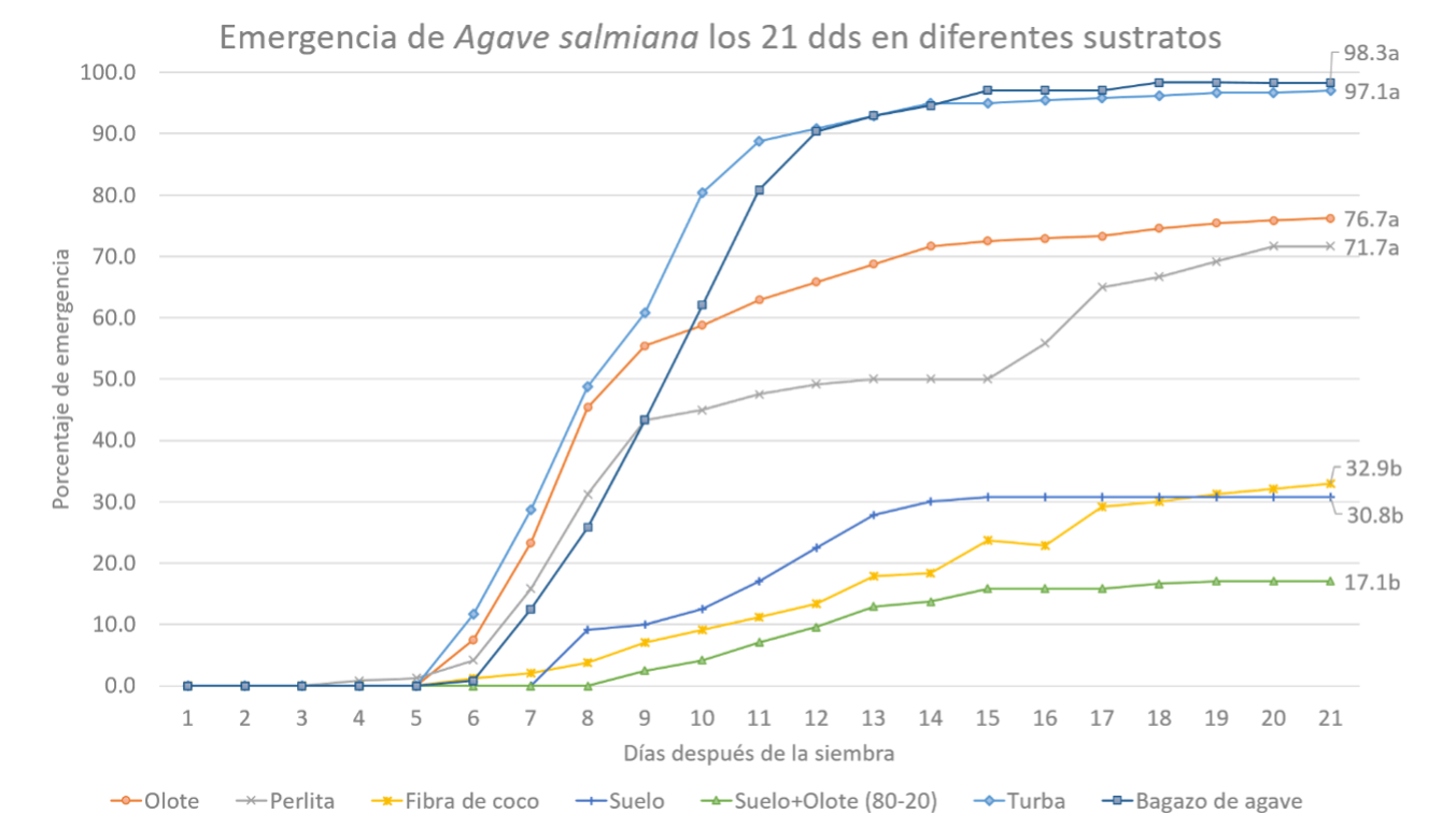 En este estudio las variables porcentaje de emergencia e índice de velocidad de emergencia dan referencia del potencial que presenta el sustrato respecto a la emergencia de A. salmiana con relación al tiempo de germinación. Lamichhane et al. (2018) reportan que los factores que afectan la germinación pueden ser intrínsecos (propios de la semilla) y extrínsecos (factores bióticos y abióticos del ambiente), con lo que se puede explicar el efecto de los diferentes sustratos sobre la germinación y emergencia de semillas de agave. Lo anterior indica que el bagazo y la turba presentan estas características óptimas para la germinación y emergencia de A. salmiana. Cabe destacar que este trabajo se considera pionero en el cálculo del índice de velocidad de emergencia para la especie A. salmiana con diferentes sustratos.