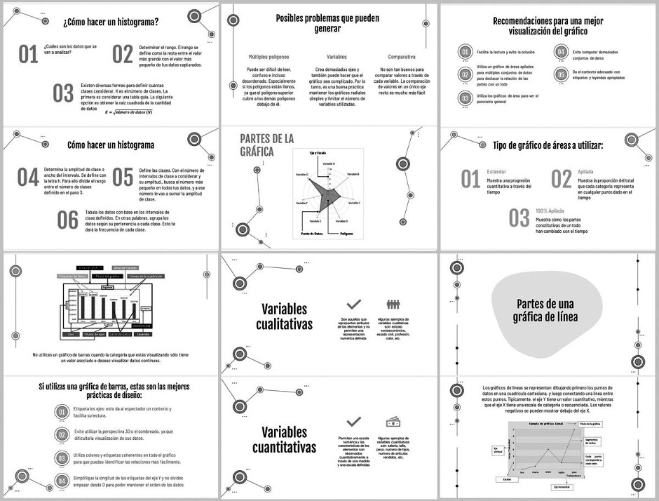 A continuación, se describen con mayor detalle las tres etapas del estudio. La primera etapa se enfocó en el diseño de materiales e instrumentos utilizados durante el estudio, los cuales son resultado de identificar en el experimento previo las necesidades de los estudiantes. Se elaboraron materiales específicos para cada tipo de gráfico estadístico que la docente utilizó durante la intervención teórica sobre el tema (Figura 1). Estos materiales fueron entregados a los estudiantes como recursos de estudio para la siguiente etapa.