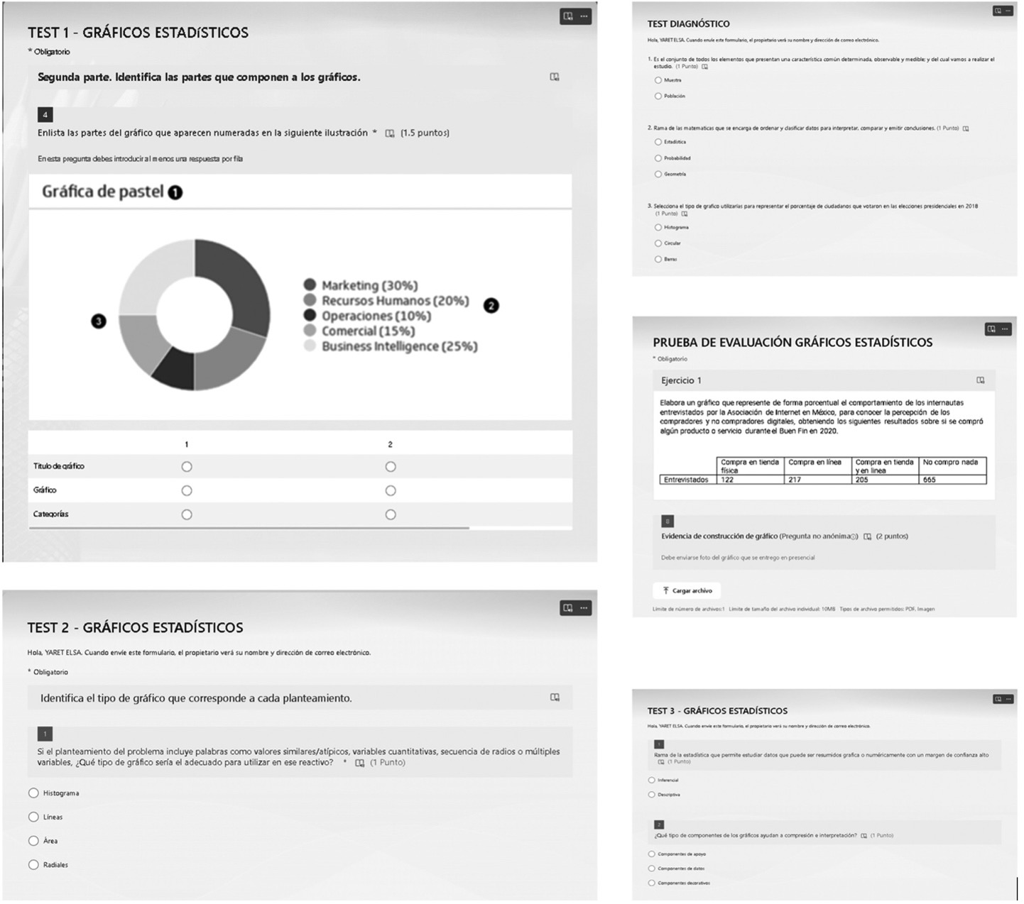 Es importante señalar que los datos para los ejercicios prácticos provienen del sitio web de la Asociación de Internet de México1 , el cual proporciona información actualizada sobre hábitos de internet, comercio electrónico, comercio móvil, entre otros temas. El objetivo fue asegurarse de que los ejercicios se basaran en tópicos relevantes y actuales para los estudiantes. Simultáneamente, se crearon formularios en la herramienta Forms de Microsoft para recopilar la información de cada uno de los tests y la prueba de evaluación utilizada en la siguiente etapa del estudio (Figura 2).