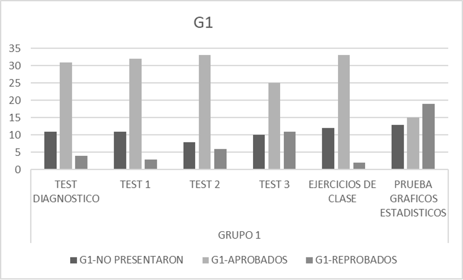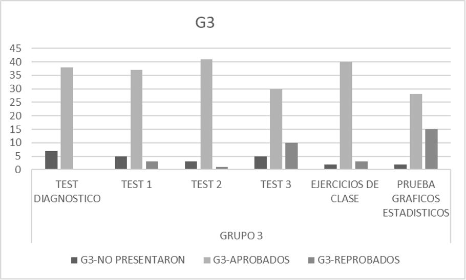 A partir de la Figura 5, se puede notar que las variaciones en los resultados de los tests son muy similares a los otros grupos; sin embargo, resalta el hecho de que el nivel de reprobados en las pruebas de gráficos es menor en G3 que en los demás grupos.