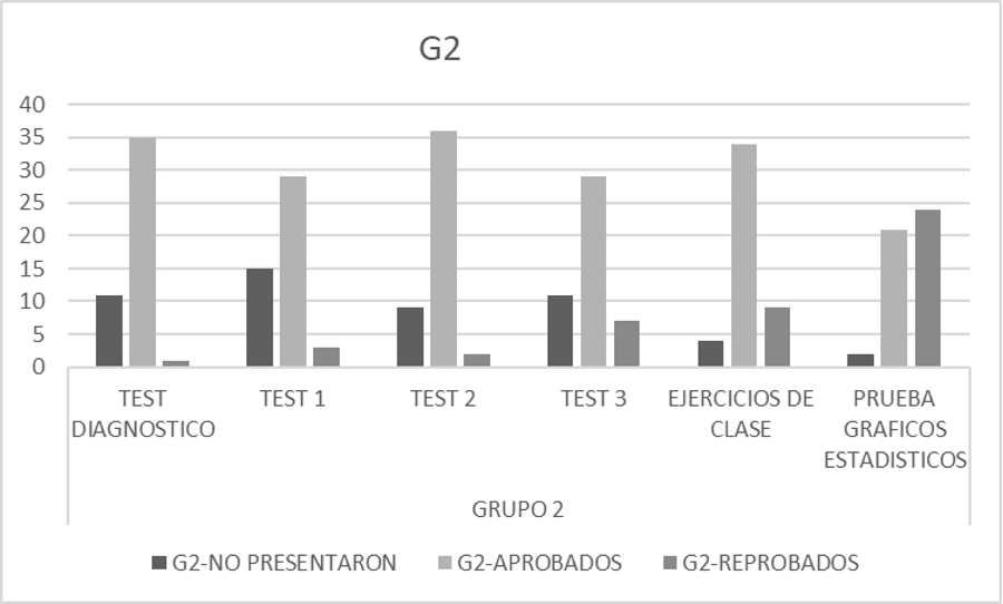 En el caso de G2, se presenta una mayor homogeneidad en los resultados de los tests. A pesar de que obtuvieron un resultado menos favorable, en este caso la diferencia resultó menos marcada que en el caso de G1. Nuevamente, los resultados de la prueba presentan menos aprobados que los ejercicios de clase y, de igual forma, más reprobados (Figura 4), lo que indica que su desempeño en la prueba independiente es menor que en los ejercicios en los que los estudiantes contaron con apoyo de la docente.