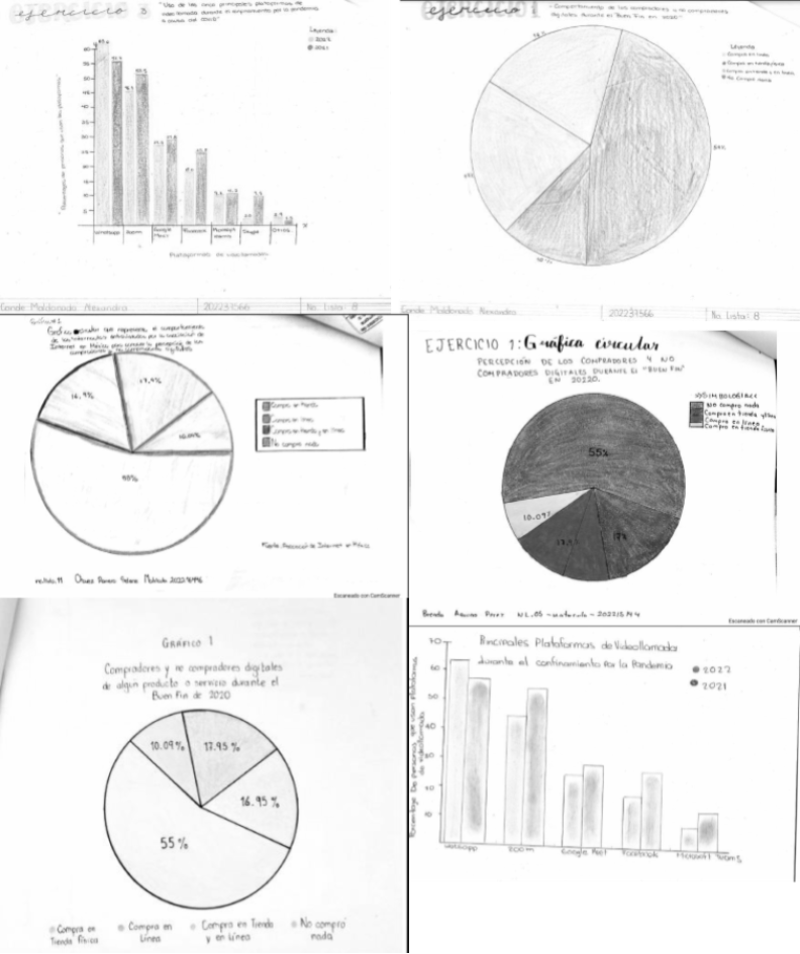En los ejemplos de gráficos deficientes se puede notar que los estudiantes cometen errores, tanto en la selección del gráfico como en sus elementos (Figura 7). Por ejemplo, se aprecia en la gráfica circular de la columna izquierda que uno de los sectores está etiquetado como 198%. Estos errores implican una falta de conocimiento estratégico del dibujo.
