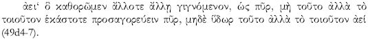 ) como un género diferente de aquello que deviene continuamente y que, si bien nombramos por ejemplo como "fuego", deberíamos con más propiedad mencionar como "este estado de cosas cambiante" (