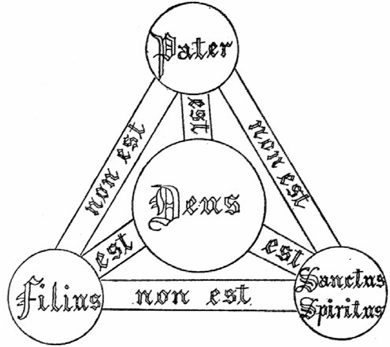 En este esquema de la Trinidad (Regester, 1898) podemos ver en primer lugar las negaciones que fungen como relación entre los diferentes elementos. Primero atendamos a aquella entre el Padre y el Hijo: "pater non est filius". Pero este "no" no nos remite al Espíritu Santo, pues el Hijo tampoco es el Espíritu Santo. Se trata de un "no" que no nos conduce al primer término. No hay negación de la negación en este sentido. En el contexto de Schelling: Dios no es el hombre, el hombre no es la naturaleza, la naturaleza no es Dios, pero al mismo tiempo, Dios y el hombre son "semejantes" (no en balde recuerda Schelling el Génesis, donde se habla de la "imagen y semejanza" entre Dios y el hombre); y también, Dios y el hombre, son naturaleza, pero no sólo. Lo único que "es" (el ser), es el conjunto, ninguno por separado. El absoluto no está entonces en ningún sitio, sino repartido y, puesto que está repartido, no puede ser recogido en una unidad simple, ni siquiera devenida. Es decir, no se produce ninguna identidad. De otro modo, la libertad estaría comprometida.