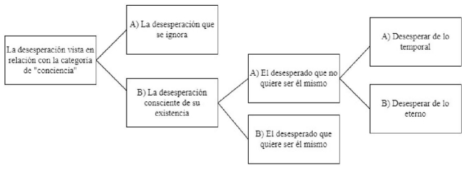La dialéctica kierkegaardiana también se funda en la contradicción como elemento articulador del devenir del espíritu. La reflexión, en ambos autores, es la encargada de enriquecer al espíritu en las distintas instancias de su viaje de reconciliación, mostrando las contradicciones constitutivas de la “fractura” del sí mismo. Por ejemplo, a partir del segundo capítulo del libro tercero de La enfermedad mortal, titulado “La desesperación vista en relación con la categoría de la conciencia”, existen varios motivos para creer que Kierkegaard se vale de la dialéctica que Hegel defiende en su Fenomenología. En primer lugar, en este capítulo del texto de Anti-Climacus, el factor determinante es la conciencia, la cual va progresando de una instancia a su contraria por la necesidad de la propia negatividad del devenir reflexivo. Así como Hegel entiende el viaje de la conciencia (certeza sensible, percepción y entendimiento) en su autorreconocimiento (autoconsciencia), Kierkegaard comprende el viaje del sí mismo en el descubrimiento de su desesperación. Las distintas instancias que relata este capítulo de La enfermedad mortal son todas necesarias en ese progresivo camino de la conciencia en su devenir unidad. Así como en la fenomenología hegeliana el entendimiento no puedo analizarse primero que la certeza sensible, o la percepción, en este capítulo de La enfermedad no puede tratarse del desesperado consciente de serlo antes que del inconsciente, dado que es un movimiento dialéctico que necesita autoafirmarse primeramente como negación para superarse a sí mismo y reconocerse en un nuevo devenir, en un nuevo movimiento.