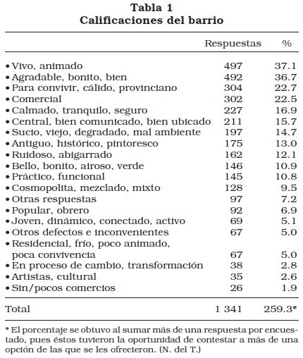 Para la mayoría de quienes viven en los barrios gentrificados que fueron investigados, los comercios (y los comerciantes) son un componente importante de la identidad de su barrio. En este sentido, a la pregunta "¿Podría describir su barrio con tres palabras o adjetivos?", cerca de un cuarto de los encuestados destacó de modo explícito la fuerte presencia de los comercios ("muy comercial", "bien surtido", "muchas tiendas", "encuentras todos los comercios", etcétera). Más aún, después de los reactivos "vivo, animado" y "agradable, bonito, bien", el que se eligió con mayor frecuencia fue "comercial", de igual forma (o casi) que "para convivir, cálido, provinciano", muy por delante de aquellos relativos al entorno construido o a la población de estos barrios (véase tabla 1).5