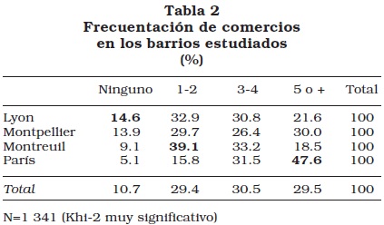 Estos usos diferenciados del comercio local no se dan de igual forma en los distintos contextos estudiados. Por ejemplo, los residentes del barrio Daguerre, en París, son muy asiduos en el uso de los comercios, pero se reúnen con menos gente y asisten menos a los bares. En contraparte, los habitantes de los barrios de Montpellier tienen una fuerte tendencia a ir a los bares y a hacer un uso más limitado de los comercios (véanse tablas 1 y 2).