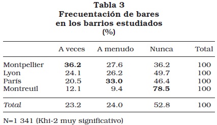 Otra práctica común entre la población encuestada es asistir a los bares, aunque sin alcanzar el nivel con el que se frecuentan los comercios. Durante el mes anterior a la encuesta, más de la mitad de los individuos interrogados visitó, al menos una vez, alguno de los bares de su barrio: 24% respondió "a veces" (de una a tres veces) y 23.2% "a menudo" (cuatro veces o más). Las tres cuartas partes de los habitantes que frecuentan los bares del barrio inmediatos a su domicilio lo hacen acompañados, la mayoría por sus seres más cercanos (84.3%) o por otros conocidos (43.8%), raramente por los colegas del trabajo (23.4%) y muy raramente por los vecinos (12.9%), lo cual evidencia que en estos barrios ir a un bar no es algo que forme parte del cuadro de relaciones con los vecinos, determinadas por la proximidad espacial. Por último, quienes asisten solos son aquellos que con mayor frecuencia van a los bares y ahí se encuentran con otras personas.