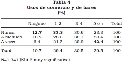 Si se consideran en conjunto estos dos tipos de uso del comercio local se verá que los individuos que a veces asisten a los bares localizados en el entorno inmediato a su domicilio tienden, en alto grado, a visitar mucho los comercios de su barrio. Al contrario, aquellos que nunca frecuentan los bares de su barrio son, proporcionalmente, quienes menos utilizan, o que usan de manera muy limitada, los comercios. Pero estas dos clases de uso no siempre funcionan juntas: en efecto, un gran número de individuos utiliza mucho los comercios de su barrio pero no frecuentan en absoluto los bares, mientras que hay otro grupo, más pequeño, que a veces o a menudo visita los bares pero que no usa, o lo hace poco, los comercios.