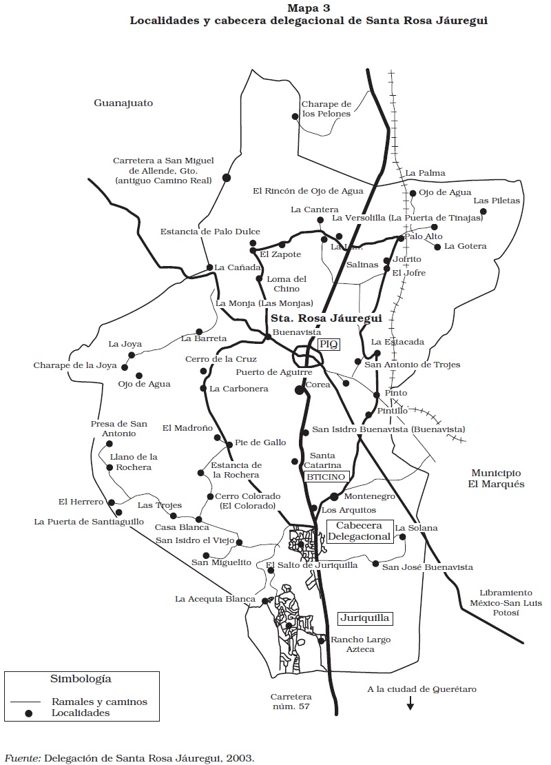 13 A 19 kilómetros al norte de la ciudad de Querétaro, por la Carretera Federal Número 57 Querétaro-San Luis Potosí, se localiza el poblado de Santa Rosa Jáuregui, perteneciente al municipio de Querétaro. Dicho poblado es la cabecera de un territorio delimitado como delegación, que es una división política administrativa del municipio. La delegación es la más grande del estado y se conforma por 42 localidades incluida la cabecera delegacional, conocida con el mismo nombre (Santa Rosa); la mayor parte de ellas (36 de las 42) son consideradas rurales pues cuentan con menos de 2 500 habitantes. La delegación de Santa Rosa Jáuregui tiene una extensión territorial de 361 km2, lo que representa 48 por ciento de la superficie total municipal; cuenta con un total de 27 523.31 hectáreas, de las cuales 81 por ciento está bajo el régimen de propiedad ejidal, mientras que el resto (19 por ciento) es propiedad privada. Para el año 2000, la población total de la delegación fue de 60 666 habitantes (de los cuales 15 301 radican en la cabecera delegacional), cifra que rebasa al total de población de 13 de los 18 municipios que conforman el estado de Querétaro. Los municipios que poblacionalmente están por debajo de la delegación son: Pinal de Amoles, Arroyo Seco, Cadereyta, Colón, Ezequiel Montes, Huimilpan, Jalpan, Landa de Matamoros, Pedro Escobedo, Peñamiller, San Joaquín, Tequisquiapan y Tolimán (Osorio, 2005). Véase mapa 2.