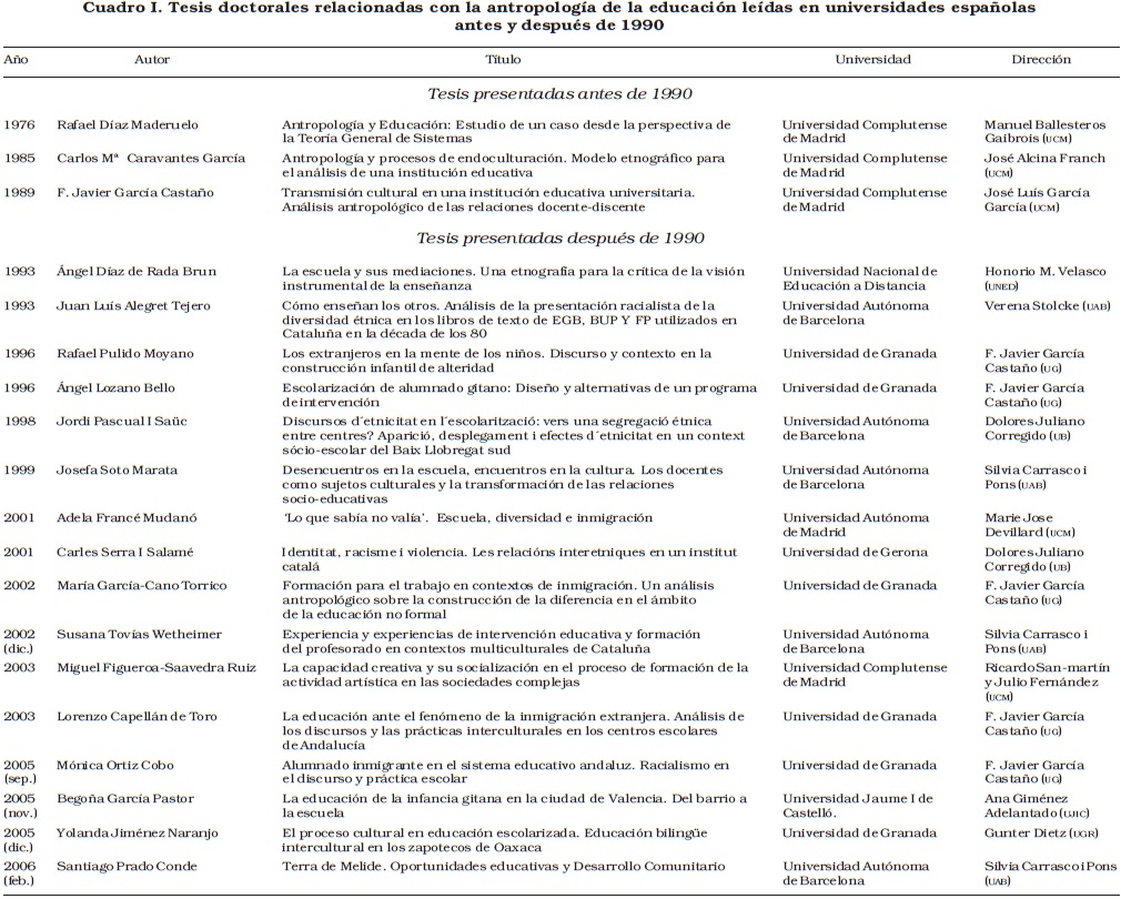 Las obras más tempranas dentro de la antropología española de la educación son tres tesis doctorales realizadas entre 1976 y 1989, lo que nos da una idea del escaso desarrollo de la subdisciplina hasta esos momentos; además, las publicaciones derivadas de estos trabajos son pocas y sus autores no continúan sus carreras profesionales dentro de este campo temático, con excepción de Javier García Castaño, quien presenta su tesis doctoral rayando ya los noventa y genera una considerable bibliografía a partir, sobre todo, de estudios acerca de cuestiones educativas que emprende tras acabar aquélla. Las tres tesis doctorales se leen en la Universidad Complutense de Madrid (Rafael Díaz Maderuelo, 1976; Carlos Caravantes, 1985; y Javier García Castaño, 1989; véase cuadro 1),12 siendo muy variados tanto los temas que en ellas se tratan de comprender y explicar (ciclos de violencia escolar, relaciones de poder en las instituciones y relaciones de sumisión entre profesores y alumnos) como los ámbitos en donde se ha llevado a cabo la etnografía (centro de enseñanza primaria y media, universidad privada y universidad pública), de suerte que sólo García Castaño, cuyo trabajo se titula "Transmisión cultural en una institución educativa universitaria" y que más tarde se encarga de dar a conocer en España esta concepción de la subdisciplina, aborda los procesos de transmisión/adquisición de cultura como objeto de estudio. Ahora bien, al contrario de lo que sucederá más adelante, no encontramos todavía investigaciones sobre las minorías étnicas (o sobre las modalidades con que la escuela enfoca la diversidad cultural) que consiguieran desplazar el interés por cualquier otro tema. De hecho, el predominio de cuestiones de esa índole en el ámbito de las tesis doctorales se inaugura en 1993 con la presentada por Alegret acerca de la diversidad étnica en los libros de texto, en una etapa en que la antropología española de la educación emprende un giro importante.