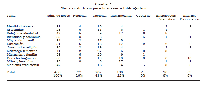 El porcentaje de literatura antropológica nacional es mayor en las tesis que tratan sobre migración interna (nacional), artesanía, economía, medicina tradicional y género (liderazgo femenino); posiblemente se deba a que estas temáticas se han tratado con mayor persistencia como parte de la identidad nacional y en relación con los diversos grupos indígenas. El tópico de la identidad, que está presente en un gran número de las tesis, tiene como referencia bibliográfica tanto a autores nacionales como extranjeros en un porcentaje casi similar.