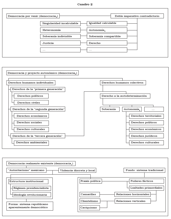 La polémica esbozada en la introducción de este texto giró en torno al carácter democrático o antidemocrático de las comunidades indígenas; empero, ninguno de los autores que participaron cuestionó el concepto de democracia al que implícitamente se adhirió. Para posibilitar la crítica, esbocé un modelo con tres niveles de abstracción creciente: la democracia realmente existente (democracia1), la democracia vista desde el proyecto autonómico (democracia2) y la democracia como concepto puro (democracia3). En el cuadro 1 se sintetizan sus principales características. Por supuesto, hay que evitar trasposiciones ingenuas: los conceptos sólo adquieren sentido dentro del nivel en que se encuentran. La autonomía de la que habla Derrida, por ejemplo, tiene poco o nada que ver con la autonomía hacia la que apunta el proyecto autonómico: mientras que la primera se refiere al sí mismo que se dicta a sí mismo su ley (autonomía3), la segunda se refiere a un régimen específico que configura las relaciones entre el Estado y las entidades autónomas (autonomía2). Por otra parte, también las autonomías de hecho o autonomías1, que en la actualidad pertenecen al nivel de la democracia realmente existente y que no necesariamente contemplan el respeto a los derechos humanos, difieren de las autonomías2, que se encuentran en el nivel de la democracia2 y que de acuerdo con el Convenio 169 de la oit y la Declaración sobre los Derechos de los Pueblos Indígenas de la onu sí contemplan el respeto a los derechos humanos.
