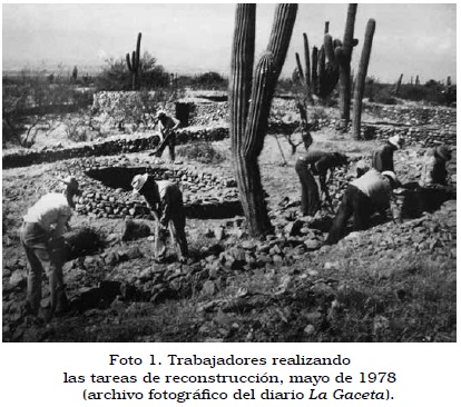 Los sentidos otorgados al sitio fueron variando en la medida en que la restricción de este espacio se sumó no sólo a la propuesta de tornarlo objeto con valor de cambio y exhibición en el mercado, sino también al hecho de que muchos de los pobladores y otros de localidades vecinas fueron convocados como empleados de baja jerarquía para trabajar bajo contratos temporales en la reconstrucción de la Ciudad. En efecto, este último aspecto se vinculaba con otro problema al que se enfrentaban quienes dirigían las tareas de la reconstrucción; la dirección de la mano de obra. En este sentido, el reclutamiento y la dirección de la mano de obra merece especial atención. Si bien la responsabilidad de las acciones desarrolladas en esta empresa correspondía a la Secretaría de Turismo de la provincia, el delegado comunal nucleó en su persona tanto las tareas de reclutamiento de los trabajadores como la organización del trabajo en el lugar. El criterio para seleccionar el personal fue, según él, la "voluntad, cercanía y conocimiento del lugar", ya que facilitaba el traslado y se aprovechaba la experiencia que los lugareños tenían de las técnicas de construcción de los originarios o antiguos; por ejemplo, las técnicas de construcción en piedra y el conocimiento del terreno y de la vegetación local. Al parecer, el gobierno provincial habría dispuesto enviar a personas desempleadas residentes de San Miguel de Tucumán, pero esta propuesta fue rechazada por el delegado, pues no sólo consideraba que la gente del lugar era más idónea para realizar el trabajo, sino que también estaba sin empleo. Esta cuestión se vinculaba con la crisis económica que, desde mediados de los años sesenta, experimentaba la principal fuente de trabajo de la provincia: la industria azucarera.14 A dicha crisis se sumaba el problema de la estacionalidad que caracterizaba al trabajo en la zafra. Por lo tanto, a fin de paliar esta situación, el gobierno tucumano implementó el denominado "plan interzafra" e insertó en él el trabajo de reconstrucción de la Ciudad, entre otras labores de obras públicas: "fueron elegidos, en cuanto a la mano de obra, pobladores que durante el período interzafra queda[ba]n sin ocupación" (La Gaceta, 8 de mayo de 1978: 10) (foto 1).