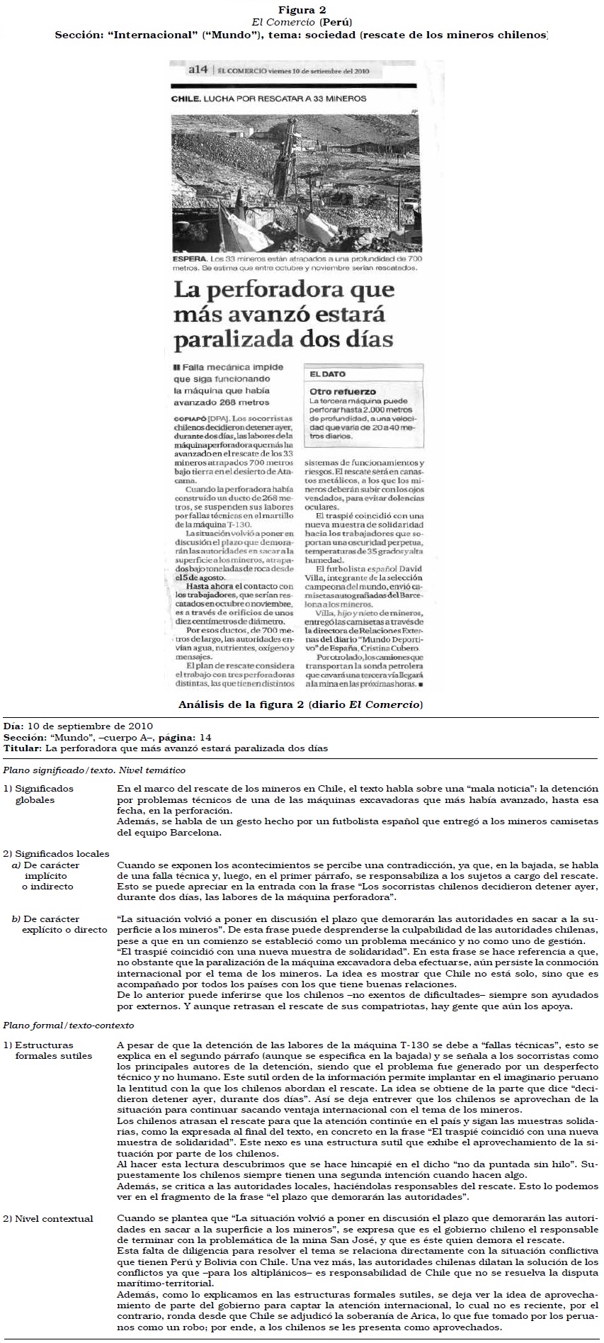 1) Sección "Internacional"; tema: sociedad (rescate de los mineros chilenos). Como ya se mencionó, dada la contingencia informativa, la mayor cantidad de noticias publicadas en el diario peruano fueron las que trataban sobre el rescate de los mineros atrapados tras el derrumbe de la mina San José, en la región de Atacama, en Chile. Del total de 17 informaciones publicadas por el medio peruano, 14 se relacionan con este tema (82 por ciento del total de noticias analizables). Una de las notas que permitió ver la construcción del imaginario de los chilenos como poco honestos es la que se refiere a uno de los mineros atrapados, Jhonny Barrios, y su relación simultánea con dos mujeres. A pesar de ello, Barrios es reconocido por las autoridades chilenas: "Esa función ha sido valorada por el propio ministro de Salud, Jaime Mañalich, quien lo considera como un gran aliado" (El Comercio, 3 de septiembre de 2010). Es de gran relevancia destacar que la cita anterior alude al rol de enfermero que desempeñó este minero pero, al mismo tiempo -al mencionar esta información al final de la noticia-, orienta al lector hacia una reflexión sobre la real confianza que se le da, porque si se hubiese querido resaltar los aspectos positivos de Barrios sólo se hablaría de su rol de enfermero, aunque en gran parte se comenta su infidelidad.