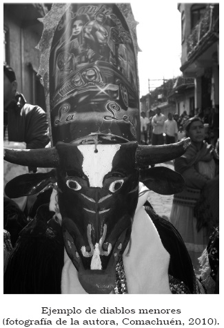 Las máscaras que usan los diablos menores tienen formas muy diversas -perros, vacas, toros, políticos en turno, etcétera-, pero en algunas distinguimos claramente al personaje por los signos visuales de la máscara: dos cuernos sobre la frente, ojos desorbitados y la lengua proyectada hacia afuera de la boca. Quienes interpretan a estos diablos encargan a un maestro mascarero o a un artesano la elaboración de sus máscaras, o las hacen ellos mismos. La confección se desarrollará a partir de una idea previa de la acción performativa que realizará aquel que se ponga la máscara.1 En este sentido, se anuda un diálogo entre la máscara y la acción performativa, entre quienes elaboran la máscara y quienes le dan vida, entre performance e imagen.