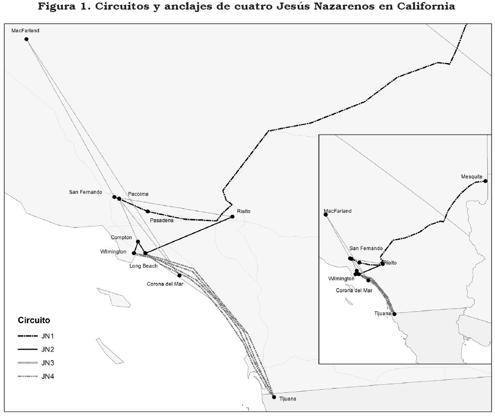 ¿Qué sucede si observamos los circuitos desde una escala nacional o transnacional? Tenemos una movilidad unidireccional, pues, con excepción de la imagen de Tijuana -la única que ha cruzado la frontera en ambos sentidos-, todos los Nazarenos parten de Patamban para "instalarse" de manera permanente en Estados Unidos: por un lado, el Nazareno de Tijuana nos habla de una condición transfronteriza, mientras que las otras nueve imágenes dan cuenta de una primera movilidad en sentido único (sur-norte) y luego de una movilidad que se circunscribe a circuitos en el interior de Estados Unidos marcados por anclajes constituidos por los hogares de los diferentes cargueros.