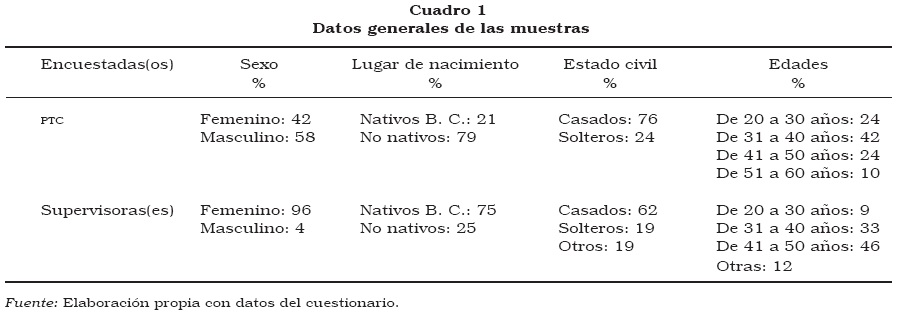 La muestra de supervisoras(es) fue de 52, en tanto la de profesoras(es) universitarias(os) (en adelante PTC), de 33. Datos relativos al sexo, lugar de nacimiento, estado civil y edades presentan divergencias en ambos conjuntos. Destaco la mayoría de mujeres entre las(os) supervisoras(es), el estatus de migrantes de la mayoría de los PTC, y la mayoría, en ambos grupos, con edades de más de 30 años (véase cuadro 1).