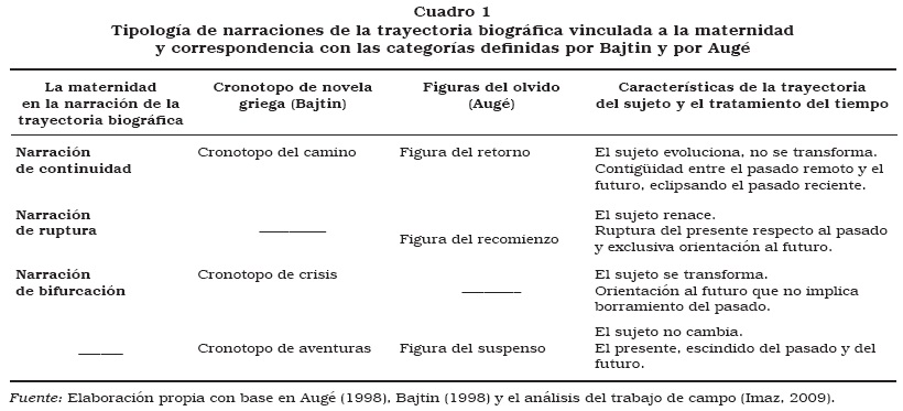 El cuadro 1 sintetiza la tipología propuesta y su correspondencia con las elaboradas por Bajtin y Augé, así como sus rasgos fundamentales. En los siguientes epígrafes muestro cómo encaja esta tipología con las experiencias de maternidad y la trayectoria biográfica relatadas por las mujeres, ilustrando, mediante casos recogidos en mi trabajo de campo, cómo el hito de la maternidad se integra en y remodela la forma de constituir la memoria de la trayectoria biográfica.