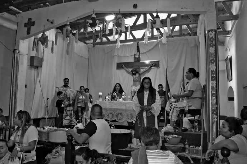17 marzo 2018. Las misas fidencistas se llevan a cabo en el teatro que utilizaba Fidencio para sus obras. Ariel recibe a varias columnas y los saluda desde este estrado, dando paso a la misa fidencista, la cual es organizada por los líderes de varias columnas. En el altar están tres mujeres con alba y estola, dirigiendo el oficio. Varios hombres las asisten, sentados alrededor del altar, alguno de ellos va maquillado y se nota su rango por estar junto a las sacerdotisas y porque después las ayudan de cerca durante los rituales. La liturgia durante la misa me parece idéntica a la católica; de hecho, se utiliza un misal. Se da la comunión, que me dice Ariel, no es el cuerpo y la sangre de Cristo, sino sólo una conmemoración. Antes, se realizó un lavado de pies corto. Todo el ritual dura bastante tiempo y mientras tanto, abajo del estrado, los asistentes podrían estar saludando, paseando, comiendo, en trance, saludando a Ariel y a Fabiola, tomándose fotos. Es una fiesta. Llega el final de la misa, las sacerdotisas reparten bendiciones. Ariel pasa al frente y dice algunas palabras. Como yo estaba muy impactada con la liturgia dirigida por mujeres y hombres claramente afeminados, […] las palabras de Ariel [adquirieron pleno sentido]: “esto es la fiesta del Señor y todo mundo puede participar, todo mundo entra, nadie es excluido, todo mundo come, a nadie se le niega nada”. La materia que liderea la misa dirige a un grupo de Monclova, Coahuila. Antes de bajar del altar, comienza la música y entra en trance; se enfila a la parte de atrás del salón donde hay unas escaleras. Las sube y junto con otro materia que traía otra misión -era el mismo que vi bailando a la Niña Aurorita el año pasado- aventaron frutas, dulces y juguetes -la limosna, le llaman-, a toda su gente. La materia baja, tocando a su paso a la gente en la cabeza, les abraza y habla al oído -incluyéndome-, cuando comienza el bai le con música regional norteña. Alrededor de la materia nos congregamos y ella toma a algunos de los presentes y baila con ellos, abrazándolos, acariciándoles, ofreciendo palabras de consuelo al oído y llorando con ellos. Caigo en la cuenta de lo emocional que es el culto, donde, en lo cotidiano, el desierto no deja espacio para gastar energía en expresar emociones, pues todos los recursos deben ser aprovechados racionalmente. Aquí, en Espinazo, todo es generosidad: de los frutos que se repartieron, de los abrazos, de las lágrimas.