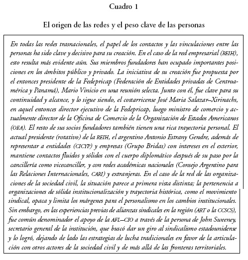 Este uso instrumental de las redes trasnacionales como herramientas para acumular mayor poder a escala nacional, se pone de manifiesto en la aparición de la red empresarial y en las similitudes de su repertorio de acción y el de la red de la sociedad civil, a excepción, lógicamente, de su posición respecto de la apertura. El carácter instrumental de ambas redes se revela en sus dificultades para alcanzar acuerdos sustantivos y asegurar su estabilidad y su permanencia. Una y otra están atadas a los problemas de carácter económico de la agenda gubernamental, y sus consensos desaparecerán a medida que la discusión avance en temas puntuales y que los gobiernos se vean obligados a hacer concesiones recíprocas.