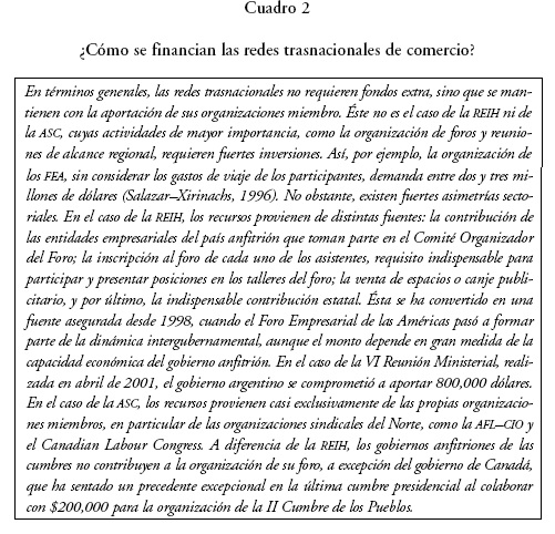 En cuanto a las motivaciones "tácitas", ambas redes coinciden en cerrar filas a lo largo del continente. Así, por ejemplo, el supuesto que guía la organización de los Foros Empresariales de las Américas (FEA) es que aceitando los contactos personales y el intercambio entre los distintos empresarios y los gobiernos, los sectores que tienen temor a la apertura o desconfianza de ella terminarán por sumarse a ella y acompañar a los demás en el proceso. Lo mismo ocurre en el caso de la ASC, donde además del conocido efecto de triangulación o boomerang (Keck y Sikkink, 1998), se logra ampliar la base de representación social y promover el intercambio de recursos y conocimiento entre las organizaciones del Norte y las del Sur, las sindicales y las ONG10 (véase el cuadro 2).
