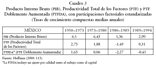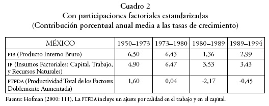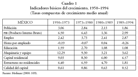 En The Economic Development of Latin America in the Twentieth Century, Hofman (2000) analiza la contabilidad del crecimiento en América Latina de 1950 a 1994. En los cuadros siguientes hemos elegido algunos resultados de interés para México y para nuestro trabajo.