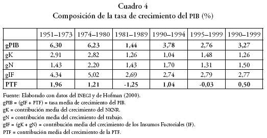 3 Es de interés notar que la participación del trabajo específica para México según los cálculos de Hofman, va de 42,7% en 1950-1973 a 35,5% en 1989-1994 (Hofman, 2000:108). Esta fuerte caída puede deberse a varios factores, entre ellos, la disminución del ingreso mixto y el descenso en los salarios reales. Sin embargo, el cálculo de la contribución de la PTFDA al crecimiento es similar cuando se utilizan estas participaciones.