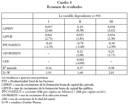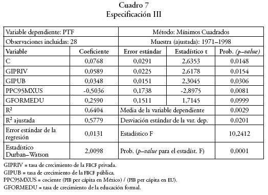 En donde PTF es la productividad de los factores, GIPRIV la tasa de crecimiento de la formación bruta de capital privado, GIPUB la tasa de crecimiento de la formación bruta de capital público, PPC95MXUS el cociente (PIB per cápita en México/PIB per cápita en EU), GFORMEDU la tasa de crecimiento de la educación formal, GEK la tasa de crecimiento de la edad del capital, y ε un error normalmente distribuido.