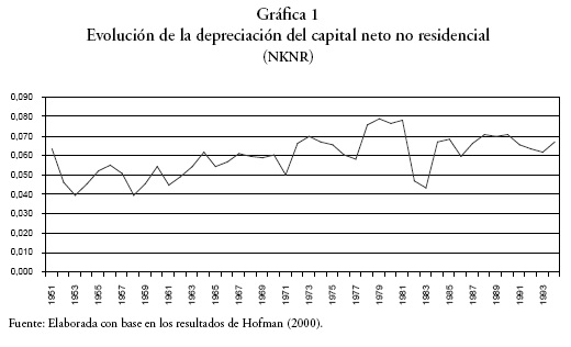 La Gráfica 1 muestra el resultado. La depreciación promedio observada durante el periodo es de 0,0595; el promedio de los últimos 5 años, que corresponden al periodo inmediato posterior a la llamada "década perdida", es de 0,065. Puesto que la diferencia no es significativamente alta, empleamos aquí una tasa de depreciación de 6%.